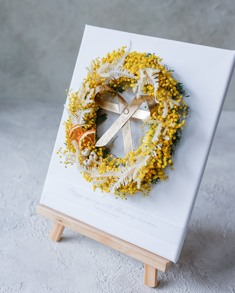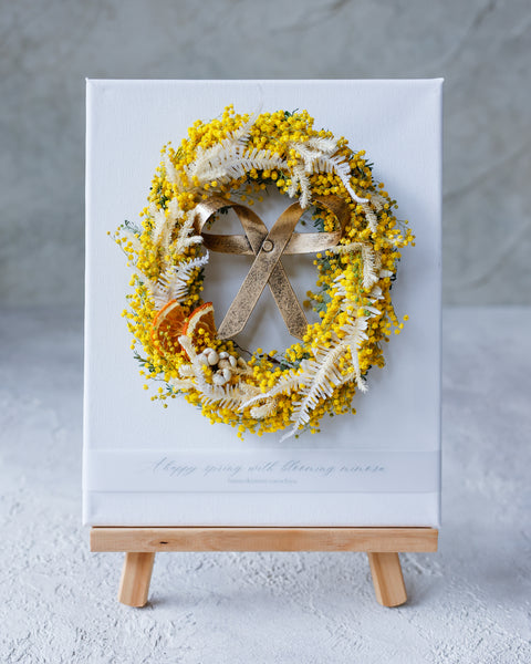 人気ドライフラワー|リビング・ギフトに人気春の象徴「ミモザ」と、真鍮リボンのオーナメントが彩るキャンバスアレンジ。